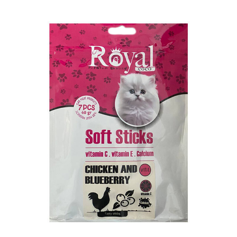 اسنک تشویقی مدادی نرم مخصوص گربه رویال کوکو با طعم مرغ و بلوبری بسته 7 عددی